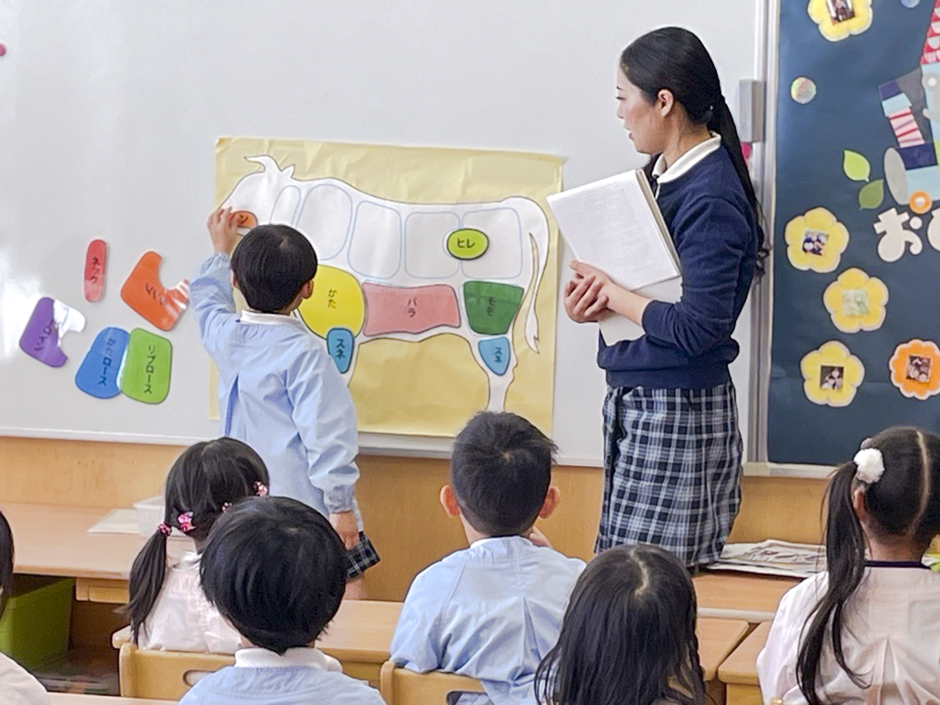 食育プログラムでは、肉料理の写真をきっかけに牛肉がどのように食卓に届くのかを学び、酪農・畜産農家の取り組みや「みかわ牛」についても紹介しました。また、絵本の読み聞かせや、牛の部位が学べるスギモトオリジナルキャラクター「スギモー」を使った塗り絵・折り紙活動も行い、園児たちは楽しみながら食に触れる時間を過ごしました。